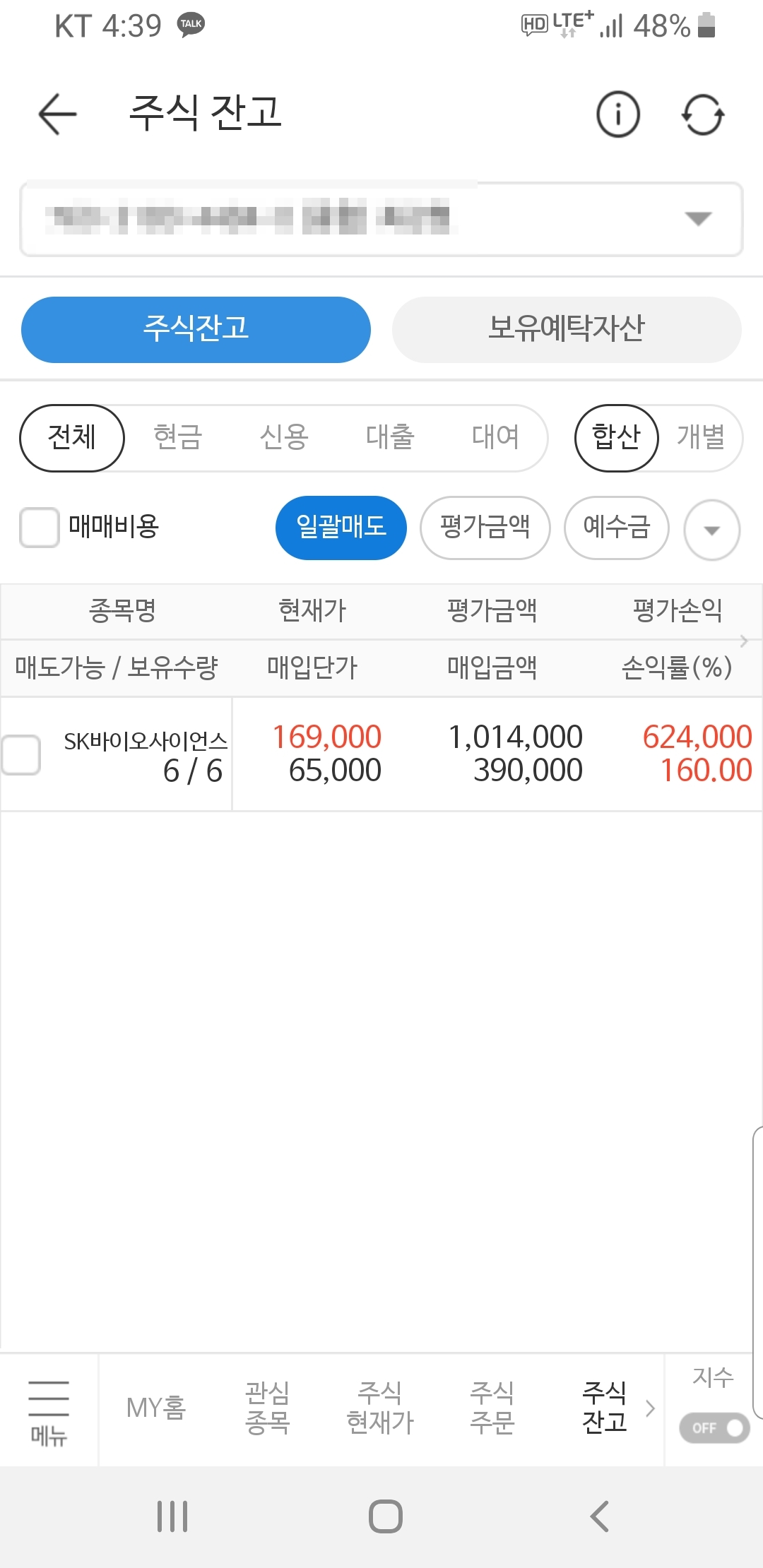 SK 바이오사이언스 상장 첫날인 3월 18일 장초반 강하게 상한가로 진입했고 당일 수익률을 160% 에 달했다. 다음날도 상한가를 가면 좋겠다는 기분좋은 상상과 수익률을 계산하며 다음날을 맞이했고 장전 동시호가 초반에 상한가를 보이다 풀렸고 초반 +12% 고점을 찍고는 오전 내내 힘을 못 받는것 같기에 대략+8% 시점에 매도했다.