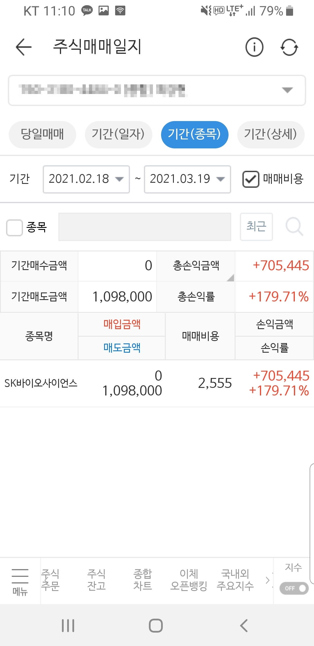 공모가 65,000 * 6 주 매입금액 390,000 원에서 매매수수료를 제외하고 +705,445 원의 수익을 내었으며 수익률은 179.7% 이다.